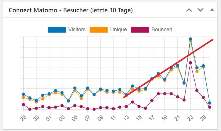 Ich weiss nicht ob es an meinem neuen Profilbild liegt, oder weil ich durch meine etwas erhöhte – durch Krankheit bedingte – Freizeit etwas mehr gebloggt habe und google gemerkt hat, dass sich meine Schreibfrequenz erhöht hat und meinen Blog nun höher rankt: meine Zugriffszahlen steigen in letzter Zeit stark an und ältere Beiträge, die ich mangels Zugriffe schon als VG Wort Einnahmequelle abgeschrieben hatte, bekommen wieder stattliche Zugriffszahlen. Ist ja auch mal schön.