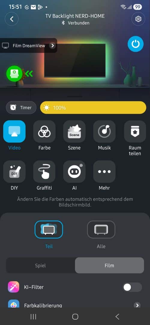 Mit der App kann man dann die Beleuchtung steuern: Helligkeit, Farbabgleich, ob die Beleuchtung auch auf Musik reagieren soll (ganz nett beim Radio hören, denn da bewegt sich ja nicht viel auf dem Bildschirm) und noch so einige andere Dinge. Selbst vordefinierte Beleuchtungsmodi von Usern kann man übernehmen.