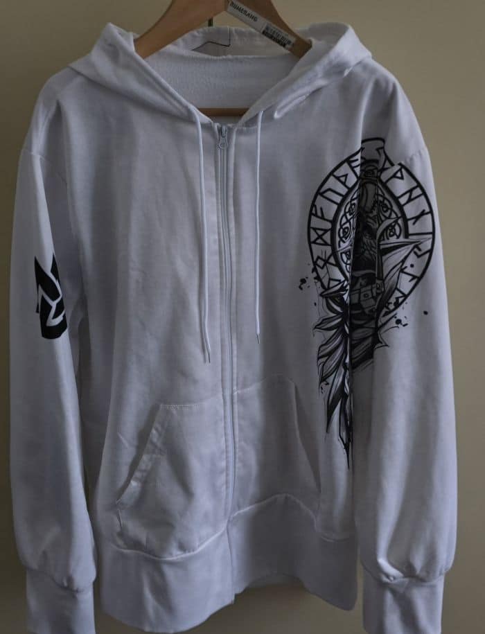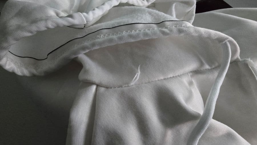 (Bild rechts: und das ist das Produkt, was man geliefert bekommt: ein Chemiefaserunfall der dazu auch noch stümperhaft verarbeitet ist. Nähte nicht grade, billiger Plastikreissverschluss ohne Stopper, und die bedruckten Teile mit sichtbarem Versatz angenäht – das ist was für das Buch „Worst of Schneidergesellenarbeit“! )