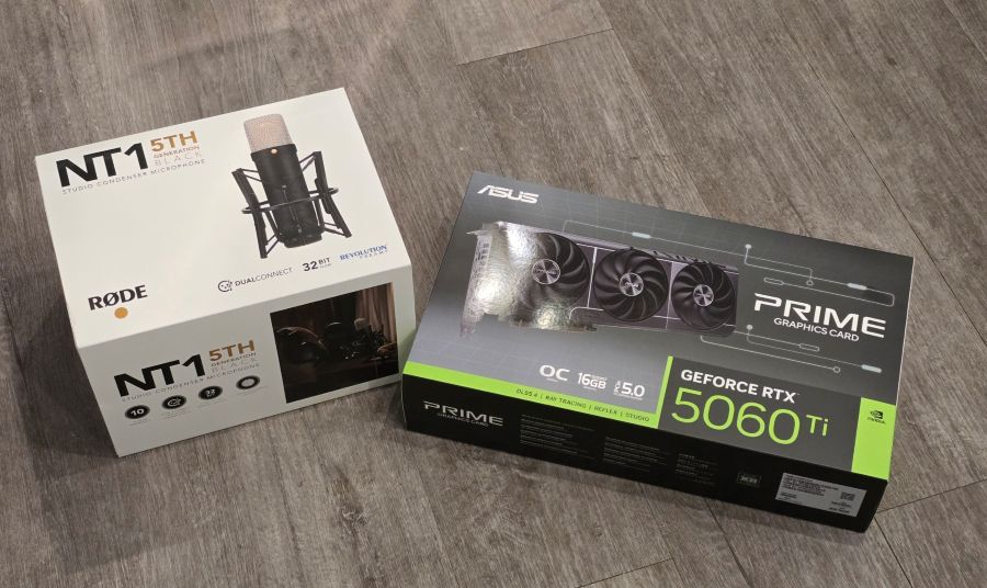 (Bild links: die drei teuersten Anschaffungen im Monatsrückblick November 2025 waren die Grafikkarte von ASUS, das Mikrofon von RØDE und (nicht im Bild der Teufel Rockster Lautsprecher). Alles drei zusammen kostete ungefähr 1.500,00 €. Damit ist mein heimischer PC und das Musikstudio aber für die nächsten 10 Jahre wieder auf aktuellem Leistungs-Niveau.)