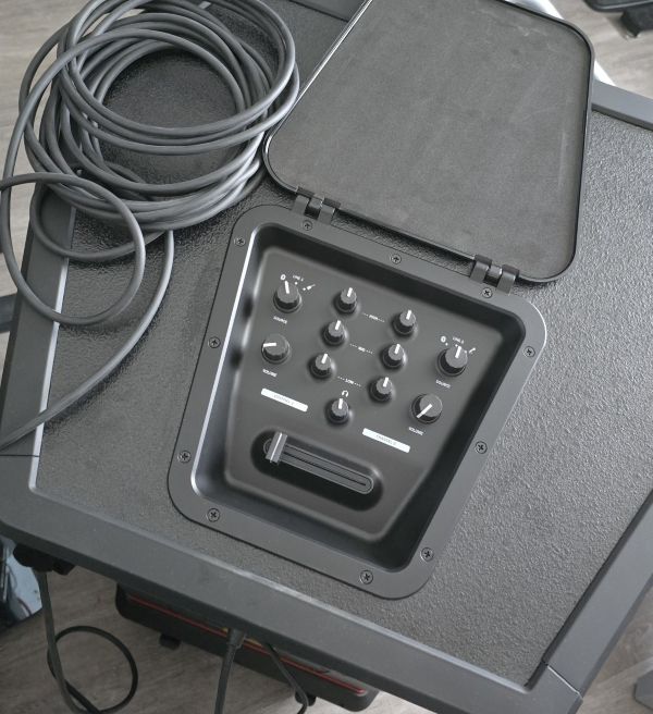 (Bild rechts: hinter einer Klappe – die magnetisch verriegelt (daran sieht man, dass die Entwickler von Teufel an alles gedacht haben) ist ein kleines Mischpult. Hier lassen sich mechanisch Überblendungen machen. Das funktioniert super! Ich habe diese Box mit meinem Omnibook gekoppelt, auf dem Virtual DJ installiert ist und ebenso mit meinem Samsung S24 Ultra. Echt Leute – das ist der Hammer – wenn die Box nicht so schwer wäre wie ein Haus – ich würde die ständig mit mir rumtragen!)