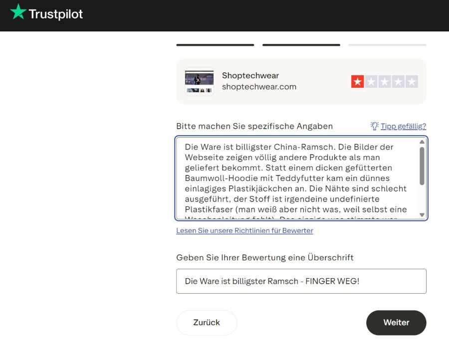 (Bild links: Auch wenn man selber reingefallen ist, sollte man nicht andere Kunden auch ins Messer laufen lassen. Zur Warnung eine Bewertung bei Trustpilot schreiben, erspart vielleicht dem einen oder anderem potentiellem Käufer einen finanziellen Schaden.)