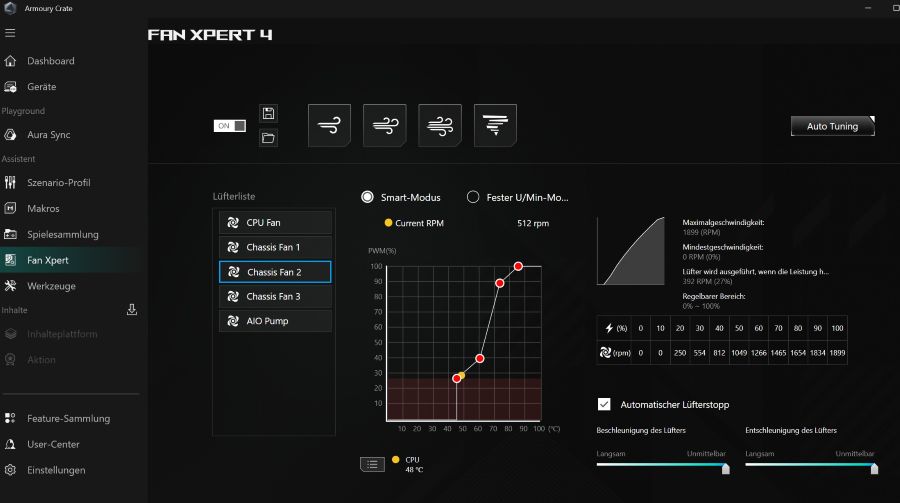 (Bild rechts: Bei ASUS gibt es eine Software namens „Fan Expert 4“ (enthalten in der Software Armory Crate), mit der man einstellen kann bei welchen Temperaturen die Lüfter eine definierte Drehzahl haben sollen. Solange das System Temperaturen unter einer von dir definierten Gradzahl ist, kann man die sogar komplett ausschalten. Noch leiser geht nicht.. )