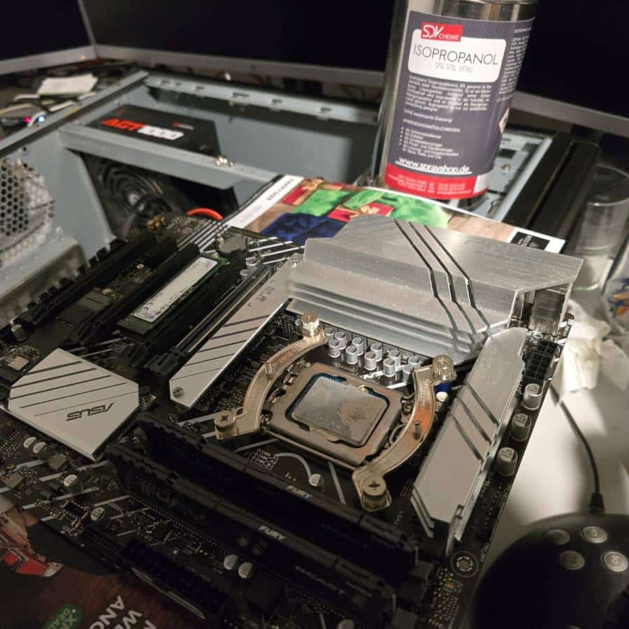 Das verstreichen mit einem Spatel hatte nur den Erfolg, dass der Spatel mit der Paste versaut wurde, aber die sich weiterhin weigerte ihren Platz auf dem Prozessor einzunehmen. Es gelang dann doch trotzdem irgendwie, denn ich hob nach dem halbwegs erfolgreichem auftragen den Kühlkopf nochmal zur Kontrolle ab und sah, dass die Paste durch den Druck beim anpressen ganzflächig auf der CPU verteilt war.