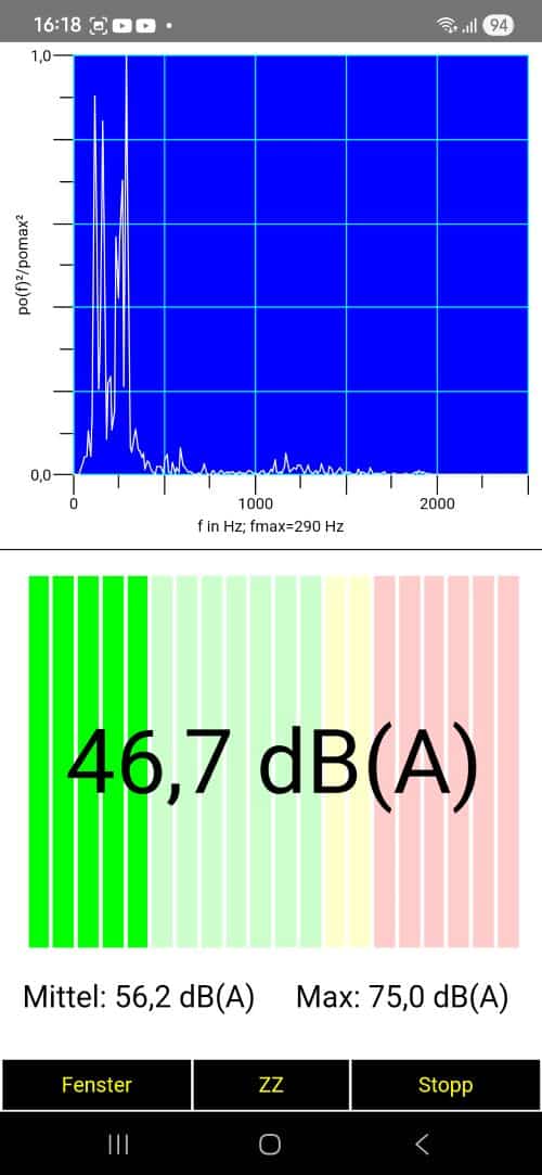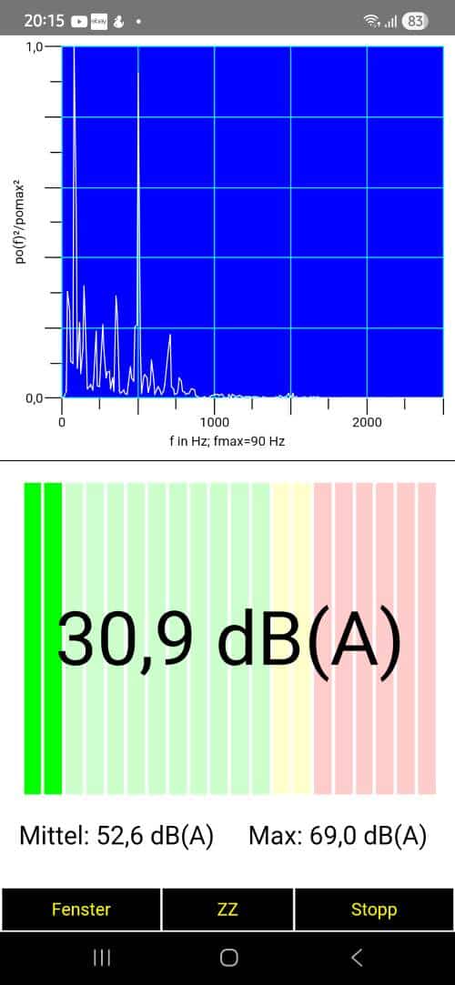 (Bild links: Mit meinem SAMSUNG S24 Ultra und der Schall-App gemessene Lautstärke zeigt: hier entstehen zwischen 50 und 60 dB(A) – das ist schon eine echt hörbare und auf Dauer nervende Geräuschkulisse. Über mehrere Stunden an diesem PC sitzen – das merkt man irgendwann an der Konzentrationsfähigkeit.)