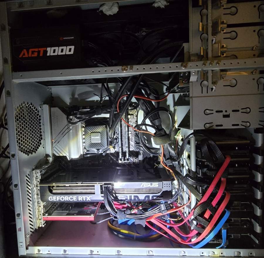 Dann musste ich den Server auf den Schreibtisch hieven – vertut euch nicht: das alte Chieftec Gehäuse aus stabilem Stahlblech wiegt alleine schon 17 Kilo – dazu kommt das Innenleben: ein fettes 1000 Watt Netzteil, die RTX Grafikkarte, 7 mechanische Festplatten und natürlich das Mainboard mit Lüfter. Da sollte man schon fest zupacken, denn ich würde mal schätzen, dass das so 22 bis 25 Kilo Gewicht sind, die vorsichtig auf den Schreibtisch gelegt werden müssen, um das Seitenteil zu öffnen um an das Herz des Rechners zu kommen.