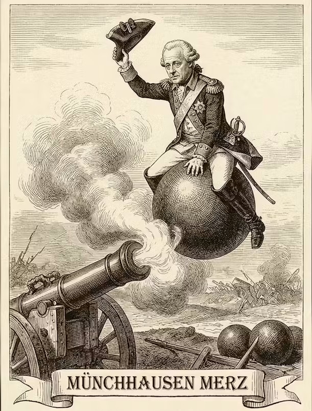 (Bild links: Münchhausen wäre sicher stolz wie Bolle auf Fritze Merz – einen würdigen Nachfolger hat er sicher lange gesucht und nun endlich gefunden: Fritze Merz: So viel Meinung bei so wenig Ahnung in einer einzigen Person vereint. Alles was über die Technik eines Lichtschalters (Spoiler: An/Aus) hinausgeht ist „komplex“ – zu komplex für ihn. Meine Gratulation für diesen Hauptgewinn geht raus ans Kanzleramt! So einen Totalausfall hatten wir schon lange nicht mehr in der BRD. Klar, Besch… Kanzler*innen hatten wir schon einige – aber gleich eine ganze Regierung? Mein Tip: packt alle zusammen in den Schrottwichteln-Sack! Bild generiert mit KI)