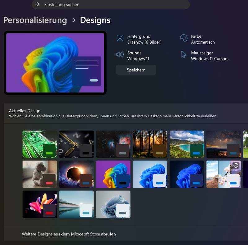 Mit Rechtsklick auf das Bild erscheint der Dialog: „Design für die Freigabe speichern“ – einmal klicken, einen entsprechenden Namen vergeben und schon sucht Windows auf dem System die Komponenten zusammen, erstellt eine Installationsdatei und packt alles für euch in eine Datei, die sich auf jedem anderen Windows 11 Rechner installieren lässt und die Änderungen auch sofort übernimmt – sogar angepasste Icons, Mauszeiger und eigene Sounds werden übernommen. Das ist nun wirklich nicht allzuviel Arbeit – außer vielleicht für einen Insider-Spezialisten aus dem Microsoft-Team.