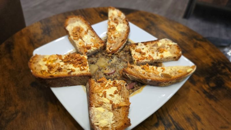 (Bild links: Ein Linseneintopf, wie er sein muss! Die halbfeste Konsistenz von einem Apfelmus, dazu ein paar Scheiben des leckersten Brotes (Feuerlaib der City Bäckerei) mit Schweineschmalz bestrichen – auf dem herrlich knusprige Röstzwiebeln darauf warten, „verschmackofatzt“ zu werden. SO MUSS DAS!)