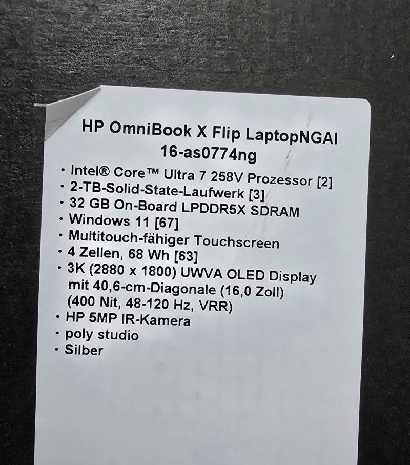 der HP Omnibook X Flip Test - und 4 oder 5 tolle Gründe die für ein 16" Tablet sprechen..(Bild rechts: Das Omnibook kam in einem schicken Karton, den die HP-Versand-Abteilung leider mit einem großen Adreßaufkleber des Paketdienstleisters verschandelt hatte. Das Omnibook ist in einer schwarzen Schutzhülle sicher verpackt gewesen. Unter dem Omnibook lagen dann in einer Pressform aus Zellstoff noch das übliche Zeug: Netzteil mit 65 Watt, Rechtliches Blabla und eine Schnelleinstiegsbroschüre.)