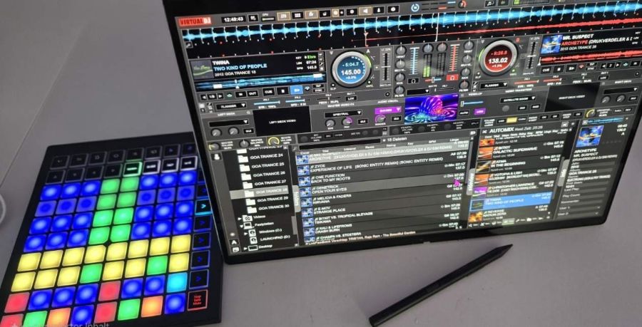 der HP Omnibook X Flip Test - und 4 oder 5 tolle Gründe die für ein 16" Tablet sprechen..(Bild links: Hier steht das Omnibook X Flip mal im Zelt-Modus. Auf dem wird grade Virtual DJ als Programm ausgeführt. Links daneben liegt ein Launchpad, welches über USB C angeschlossen ist und mit dem ich verschiedene DJ-Effekte ausführen kann. Über den HDMI-Ausgang ist noch ein weiterer Monitor, bzw. Beamer angeschlossen auf dem verschiedene Shader von Shadertoy passend zum Sound visualisiert werden. Über Bluetooth ist dann noch ein 800 Watt Bühnen-Lautsprecher verbunden – sucht jemand zufällig einen Techno-DJ?)